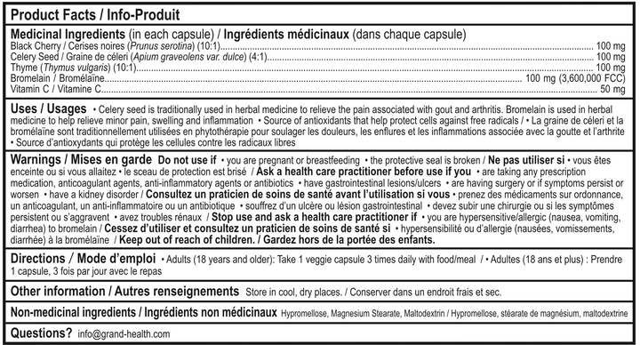 Grandhealth® Advanced Gout Relief Formula is an advanced herbal remedy specifically formulated with celery seed, bromelain, black cherry, thyme, and vitamin C for healthy joints.