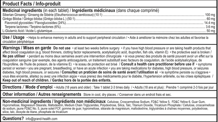 With Grandhealth® Gingko Biloba Plus formula, we have provided time-tested ingredients to support cognitive function. Our Ginkgo Biloba is standardized to 24% ginkgo flavone glycosides and has less than 5 ppm of ginkgolic acid.