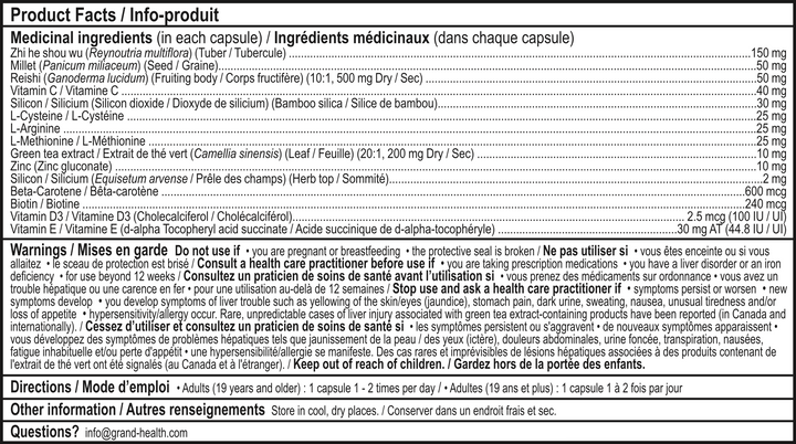 Grandhealth® Hair Essentials Plus is a comprehensive combination of herbs, vitamins and minerals that helps hair nourish and maintain overall hair health. This formula is completely free of chemical agents and genetically modified raw materials, pure vegetarian, suitable for both men and women.