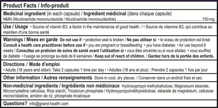 Grandhealth® Nicotinamide mononucleotide (NMN) is a biologically active form of vitamin B3 that is converted into NAD+, providing support for optimal general health.Ingredients