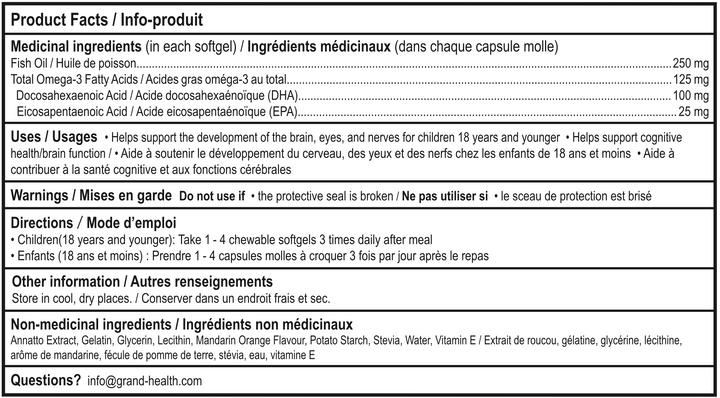 Grandhealth® Ocean Fruit DHA for Kids comes in delicious mandarin orange flavor without the fishy taste, it is easy to swallow or chew, providing all the optimum omega 3 fatty acids needed in just a tiny softgels. With the citrusy mandarin orange flavor and chewy texture of the softgel, there’s all this deliciousness, and of course the omega 3s, without a fishy taste.