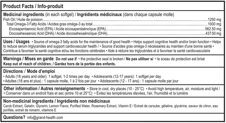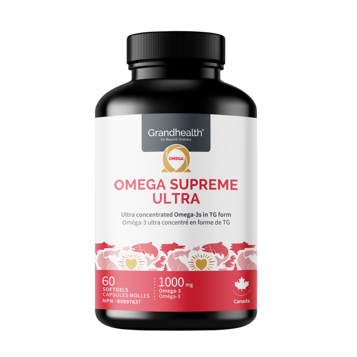 Grandhealth® Omega Supreme Ultra features the highest concentration omega-3 fish oil that contains 563 mg of EPA and 438 mg of DHA with TG from in each soft gel. Daily use of Omega-3 helps overall cardiovascular health. Grandhealth® promises that Omega Supreme Ultra fish oil is molecularly distilled and guaranteed for purity, delivering the best fish oil for you and your families.