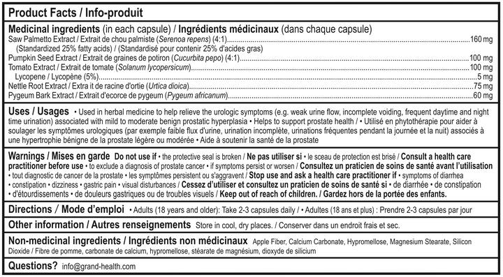 Grandhealth® Prostate Care Plus contains a synergistic blend of all natural and herbal ingredients such as Saw Palmetto, Pumpkin seed oil, Lycopene, Pygeum bark and Stinging Nettle, providing you all the essential nutrients your body needs to promote optimal prostate health.